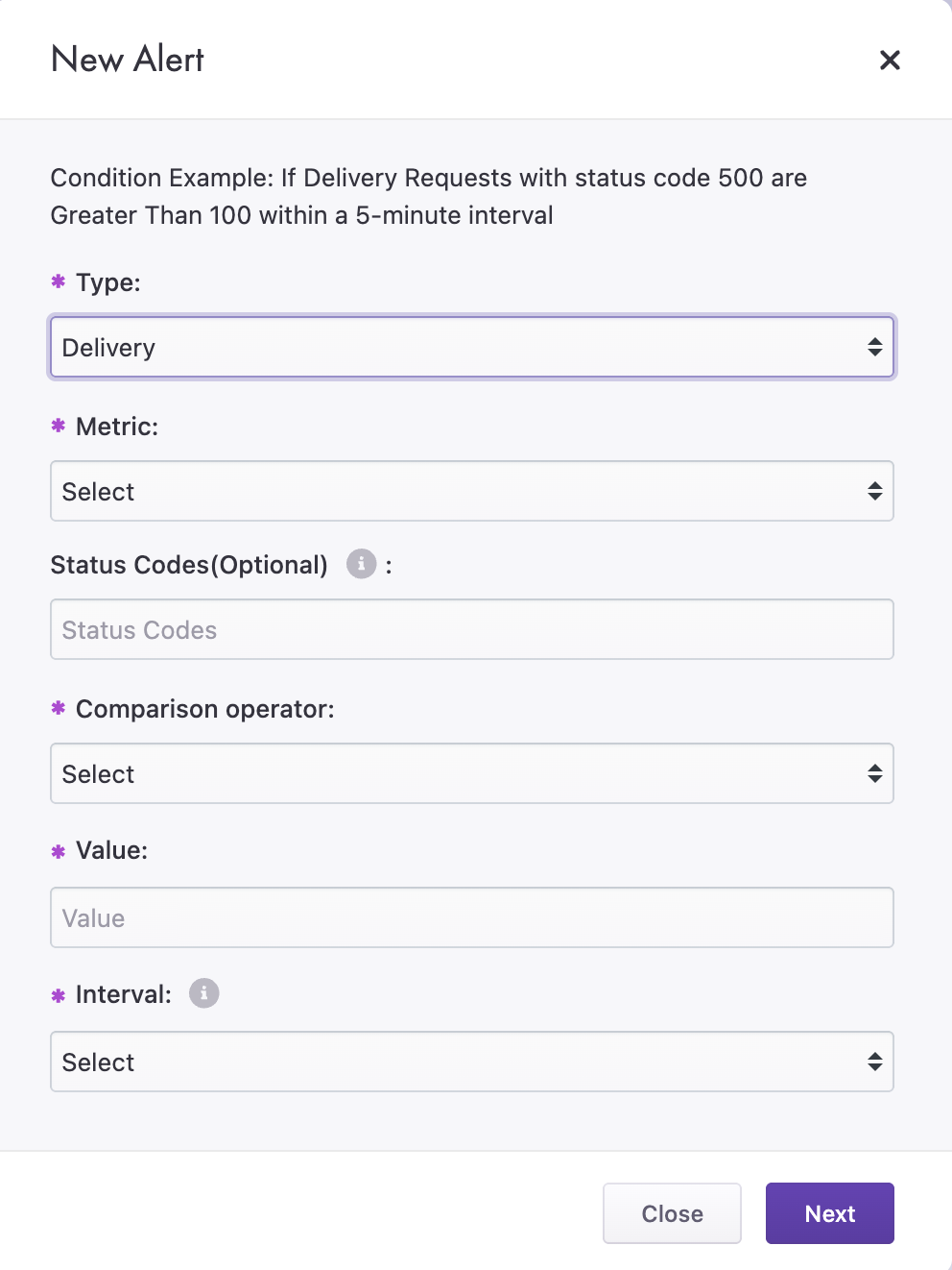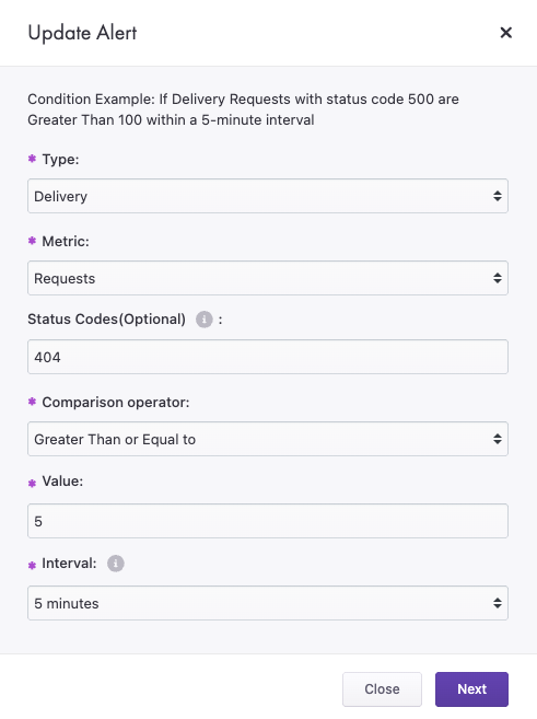 Allow alerts to monitor specific status codes (i.e. 200, 404, etc.) or wildcard status codes (i.e. 2XX, 4XX, etc.)