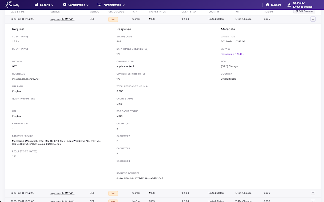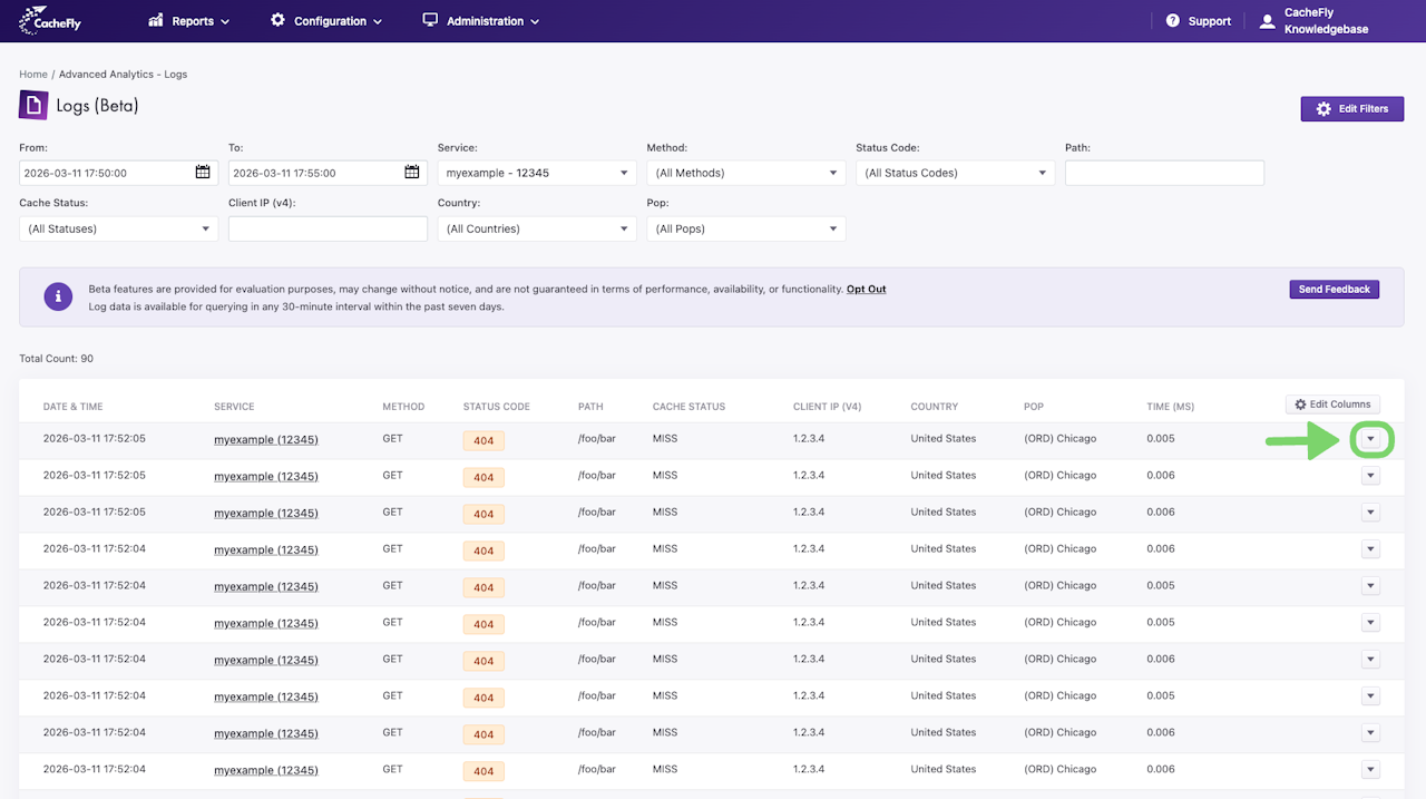 The Logs report will display a table with the requests that triggered the alert along with details for each request. The requests can be expanded using the dropdown button to the right of the log line.
