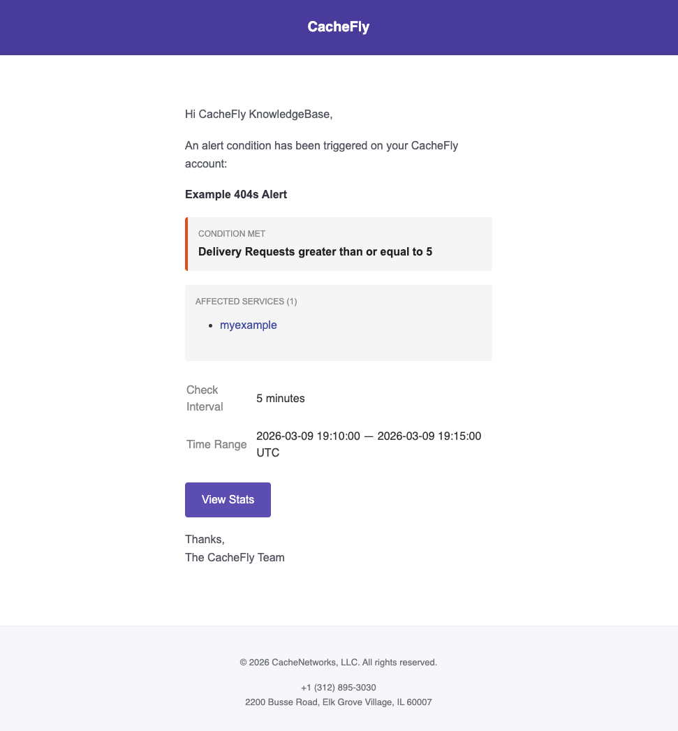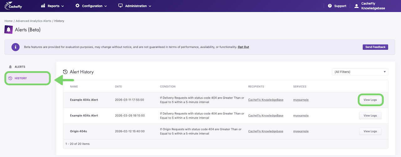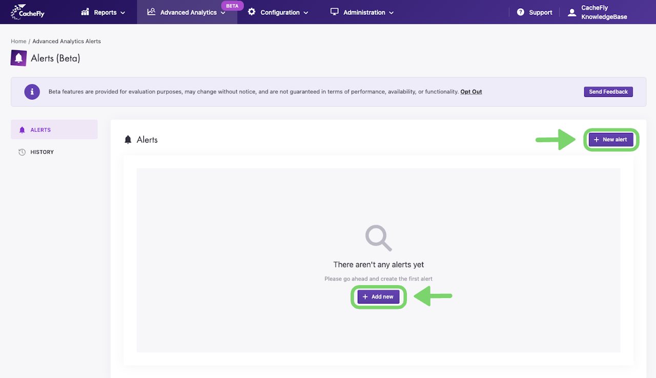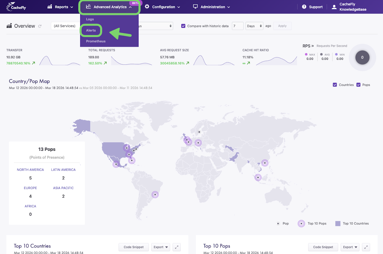 The Alerts report in the CacheFly Portal allows users to generate alerts based on configured thresholds for CacheFly services.