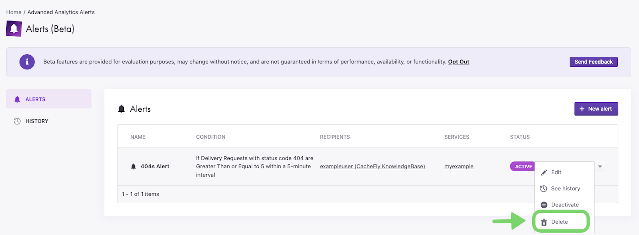 To delete an Alert, click the dropdown arrow to the right of the alert you wish to remove. Click the Delete button, then click the Delete button in the popup confirming the deletion of the alert.