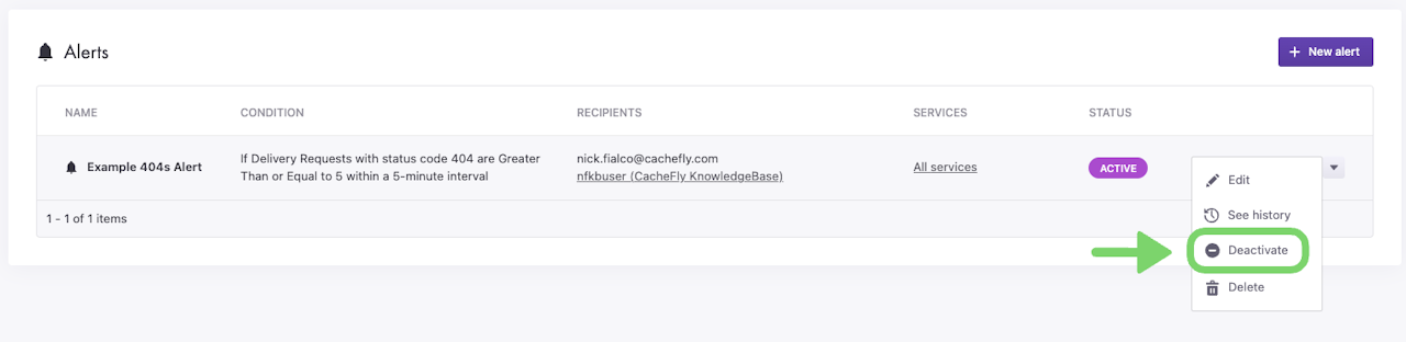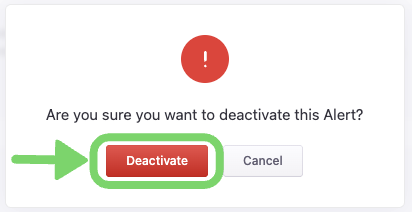 To pause alerts, you can use the Deactivate option. This can be done by clicking the dropdown arrow to the right of the alert you wish to pause. Click the Deactivate button, then click the Deactivate button in the popup confirming the pausing of the alert.