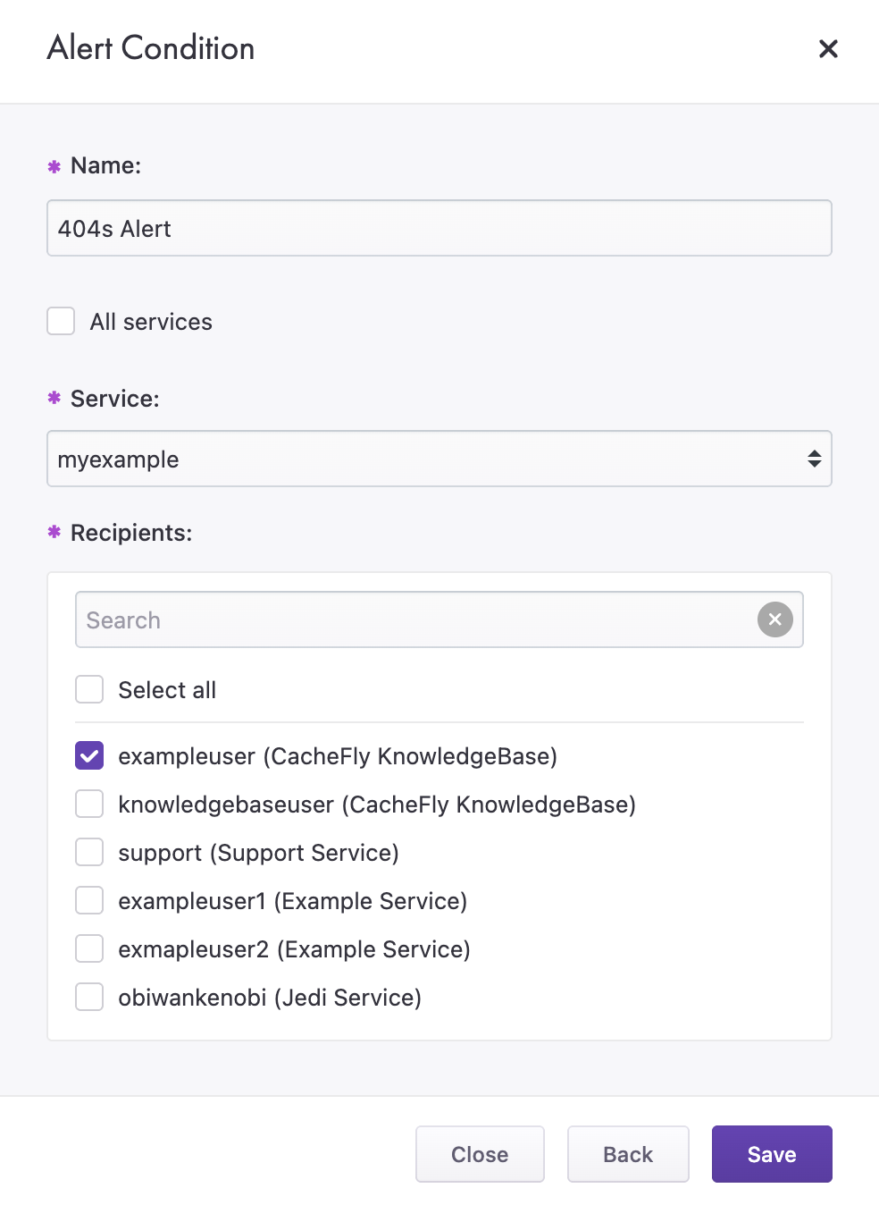 Once the conditions are configured, you will be able to give the alert a friendly name, select specific services or all services for the alert to monitor, and select the recipients that should be notified via email about the alert.