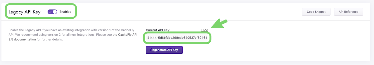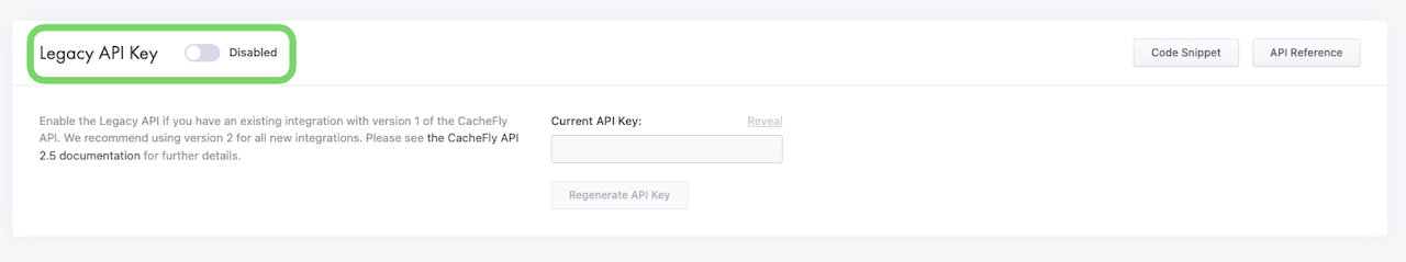 To regenerate a Legacy API Key from an Enabled state, click on the Regenerate API Key button.