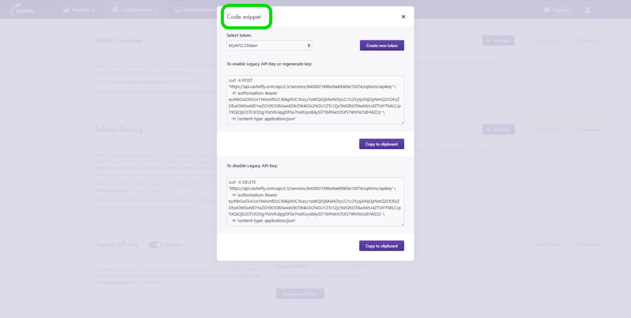 The Legacy API Key acts as a unique identifier and a secret token for authentication, and will have a set of access rights for version 1 of the CacheFly API.
