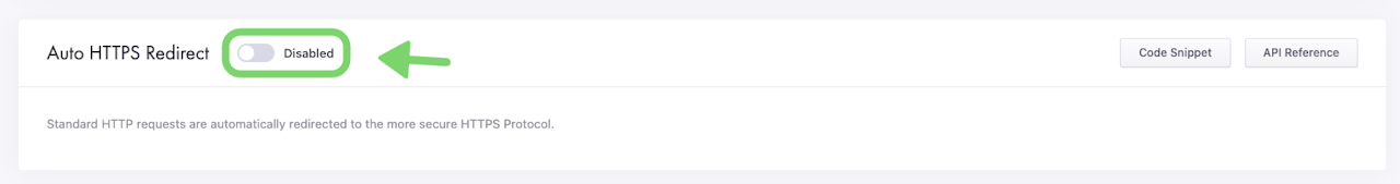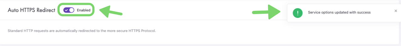If the button/toggle to the right of the mention Auto HTTPS Redirect displays Disabled, then you can enable it as follows: