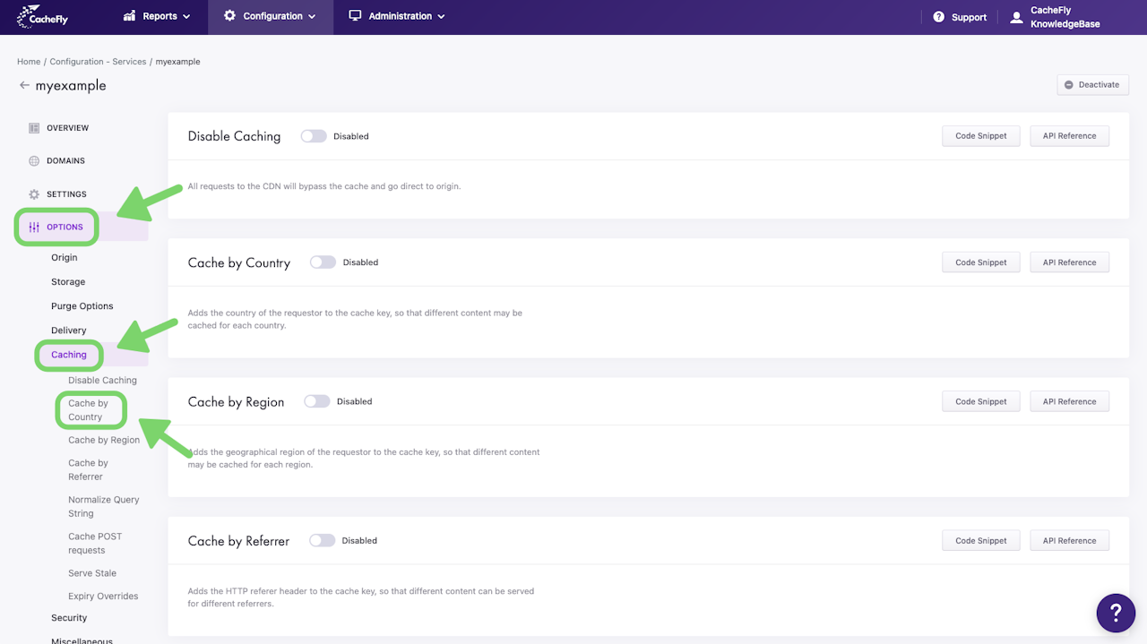 To enable Cache by Country for a specific service, first navigate to the OPTIONS for that service (Configuration > Services > [SERVICE NAME] > OPTIONS in the left-hand menu).
