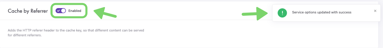 When you enable the Cache by Referrer option for a given service, the HTTP referer header is added to the cache key.