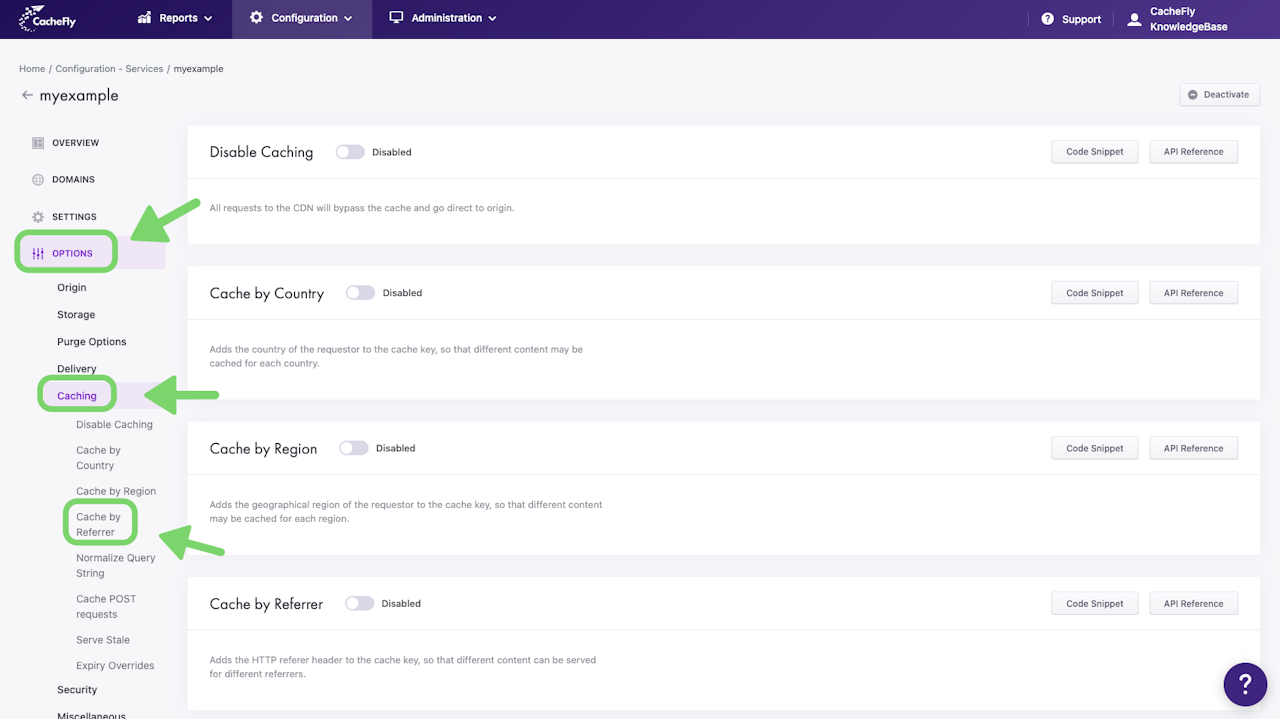 Click on OPTIONS to expand the menu. Then click on CACHING to expand all of the features for CDN caching. Click on Cache by Referrer, or scroll down until you reach the Cache by Referrer section.