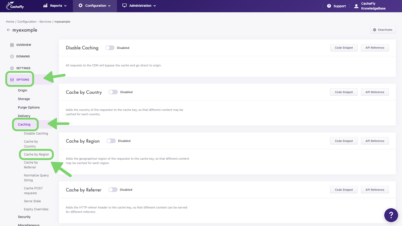 To enable Cache by Region for a specific service, first navigate to the OPTIONS for that service (Configuration > Services > [SERVICE NAME] > OPTIONS in the left-hand menu).