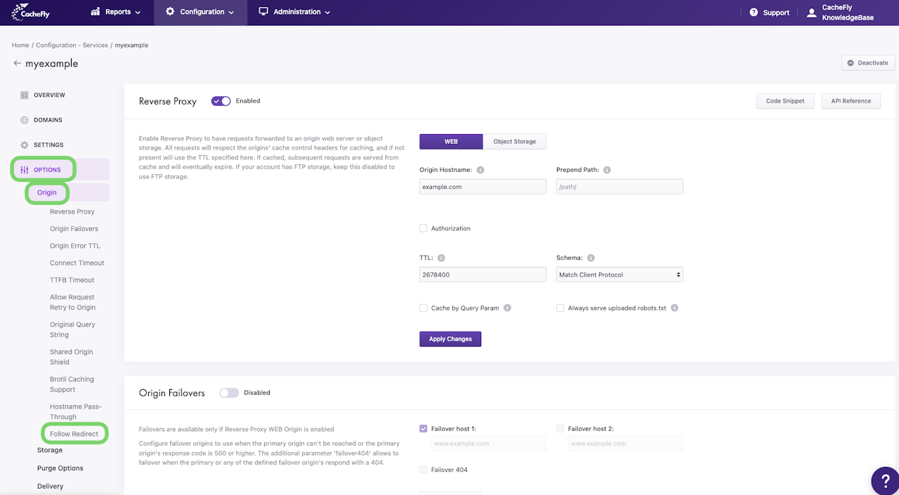 To enable Follow Redirect for a specific service, first navigate to the OPTIONS for that service (Configuration > Services > [SERVICE NAME] > OPTIONS in the left-hand menu).
