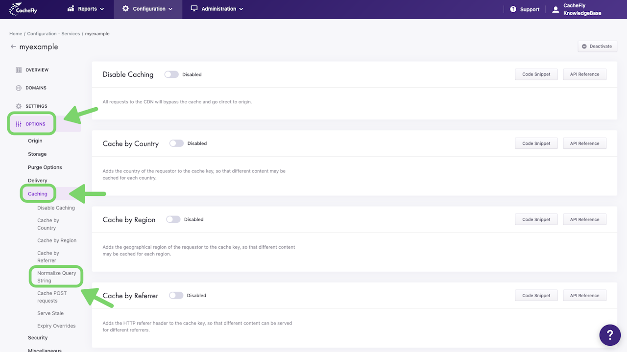 To enable Normalize Query String for a specific service, first navigate to the OPTIONS for that service (Configuration > Services > [SERVICE NAME] > OPTIONS in the left-hand menu).