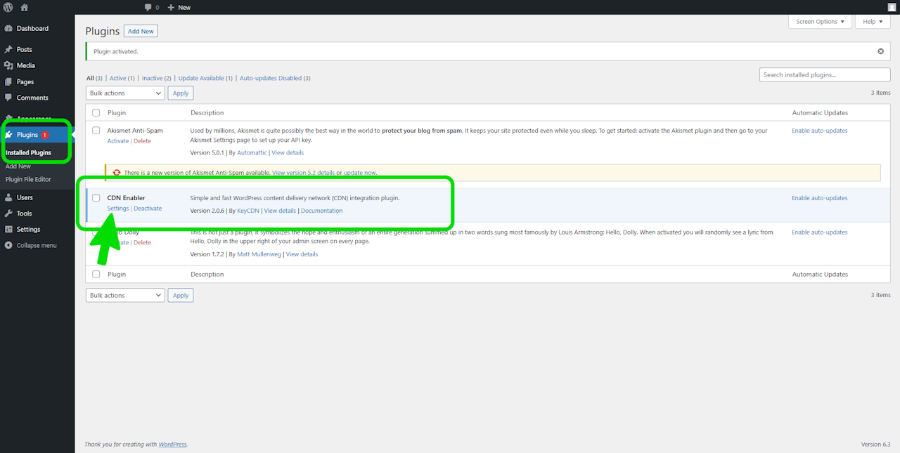 After installing and activating the CDN Enabler plugin via your WordPress admin dashboard, navigate to the list of installed plugins.