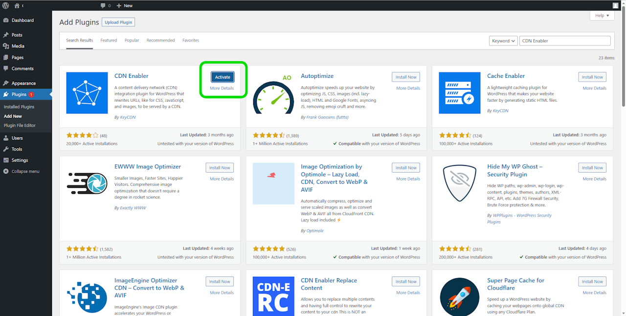 Enter CDN Enabler in the plugin search field for WordPress to show you this plugin