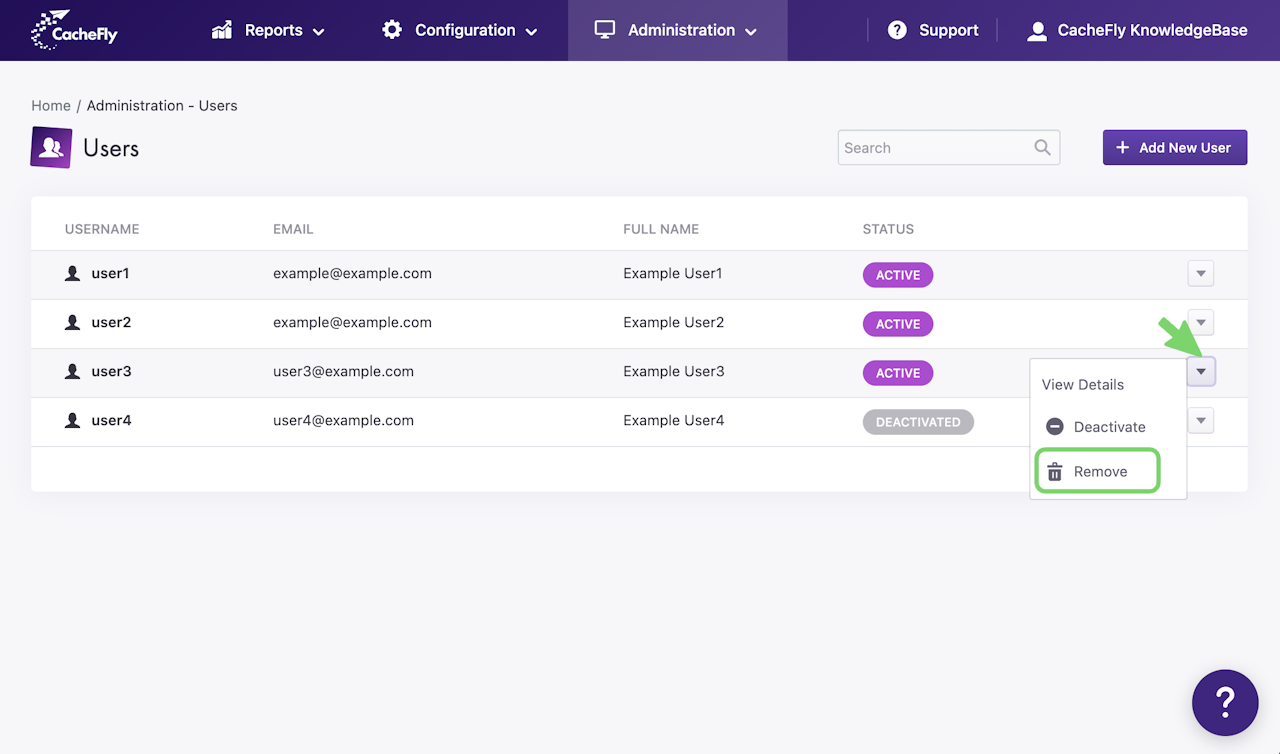 You can remove (delete) a user by clicking the down arrow at the right of the user entry in the overall Users listing (Administration > Users).