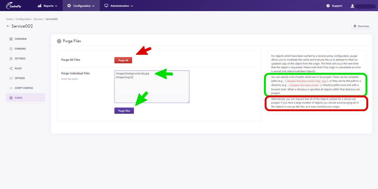 Alternatively, you can request that all of the objects cached for a service are purged.