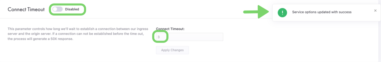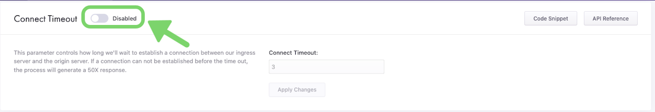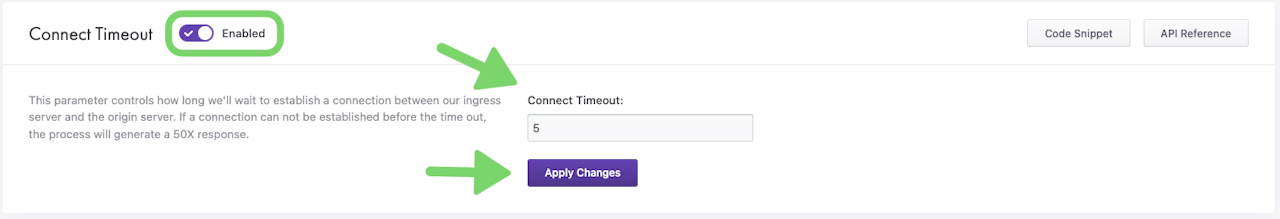 Connect Timeout defines how long CacheFly will wait to establish a connection between the CacheFly ingress server and the origin server. If a connection cannot be established before the timeout, the process will generate a 50X (server-side error) response.