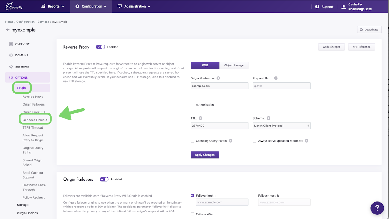 Click on OPTIONS to expand the menu. Then click on ORIGIN to expand all of the features for CDN origins. Click on Connect Timeout, or scroll down until you reach the Connect Timeout section.