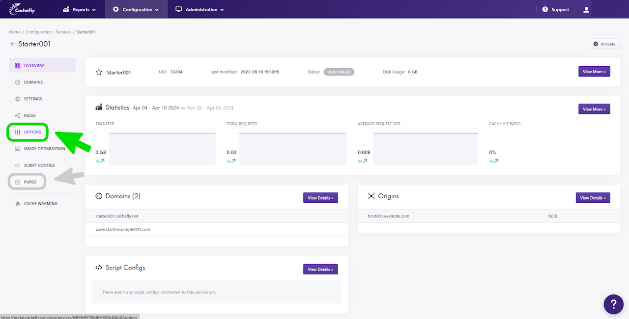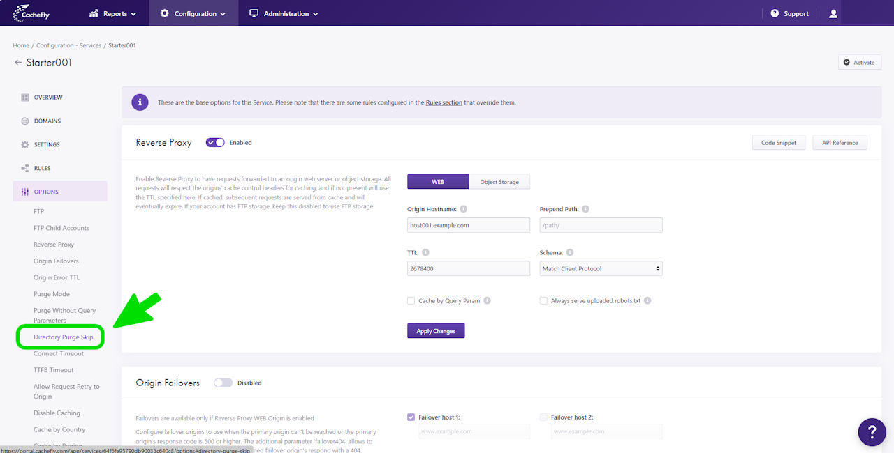 To set Directory Purge Skip for a specific service, first navigate to the OPTIONS for that service (Configuration > Services > [SERVICE NAME] > OPTIONS in the left-hand menu).