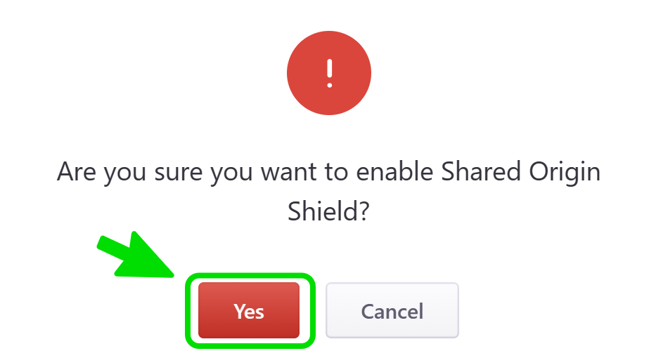 To disable Shared Origin Shield, click on the button/toggle displayed as Enabled, then click on the red button Yes in the popup window that asks you to confirm your choice. The button/toggle then turns from blue to gray and shows Disabled. A confirmatory message is also displayed briefly.