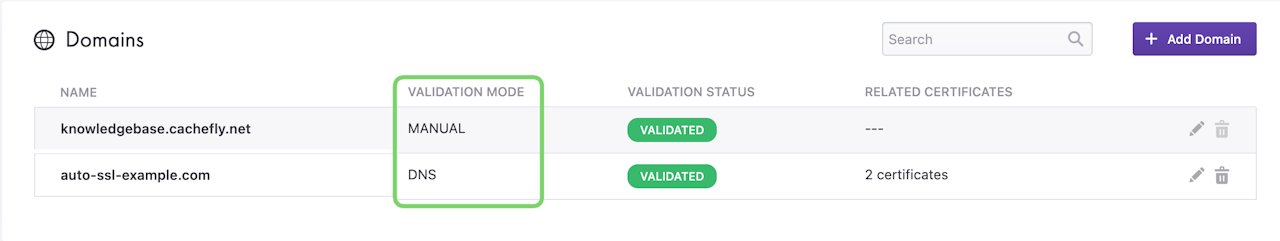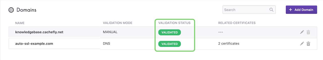 Once a domain has been successfully validated, you will see the Validation Status set to Validated and we will issue a certificate for the domain.