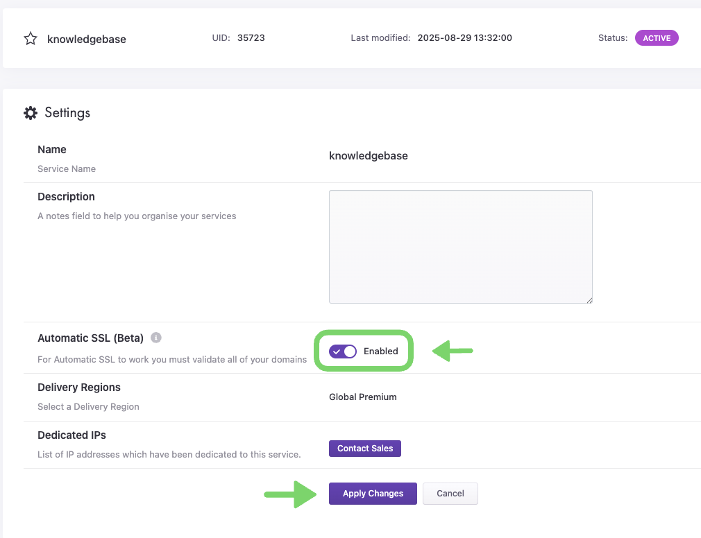 The Automatic SSL feature allows CacheFly to automatically create SSL certificates for custom domains, as long as the domains are pointing to a CacheFly service.