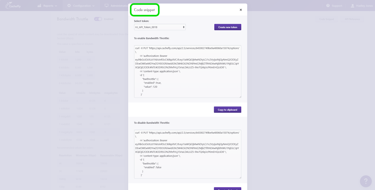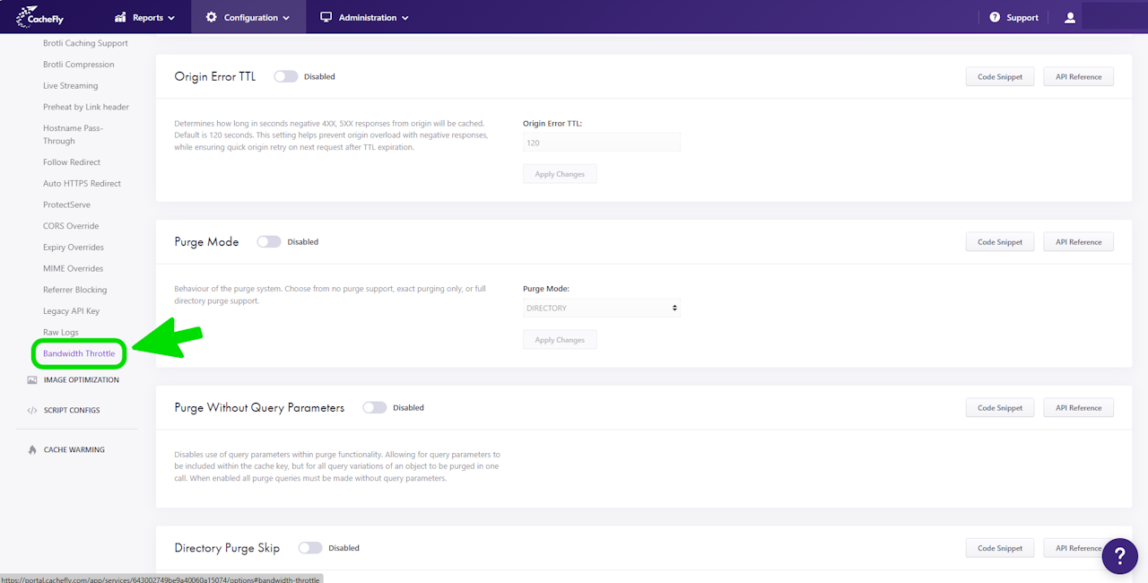 You can change the value of Bandwidth Throttle for individual CacheFly services. See more on creating and managing a service.