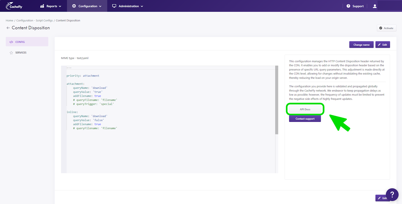Click the gray API docs button to access the Script Configs section in CacheFly's online API documentation for further information.