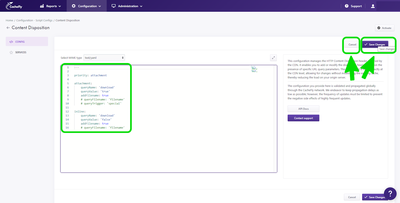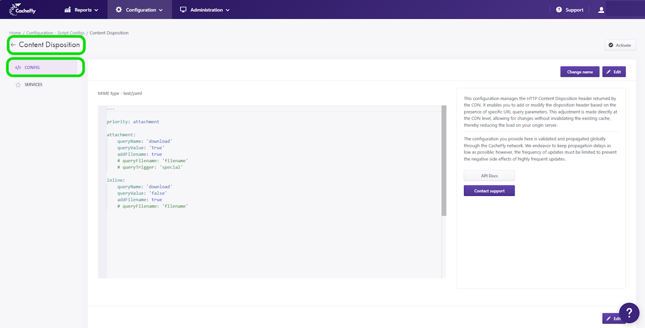 The Content Disposition Script Config manages the HTTP Content Disposition header returned by the CacheFly content delivery network (CDN). It enables you to add or modify the disposition header based on the presence of specific URL query parameters. This adjustment is made directly at the CDN level, allowing for changes without invalidating the existing cache, thereby reducing the load on your origin server.
