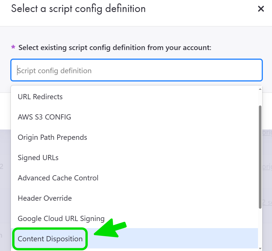 To add a Content Disposition script config to the list of script configs created for your CacheFly services in general, or to associate a Content Disposition script config with a specific CacheFly service, see Adding and Using Script Configs.