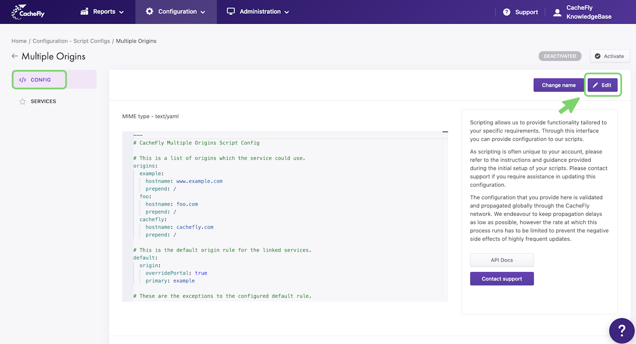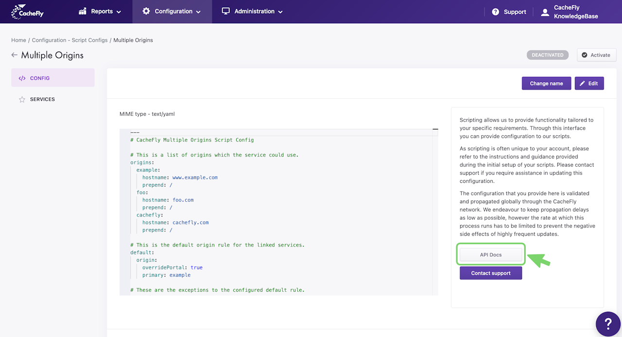Click the gray API docs button to access the Script Configs section in CacheFly's online API documentation for further information.