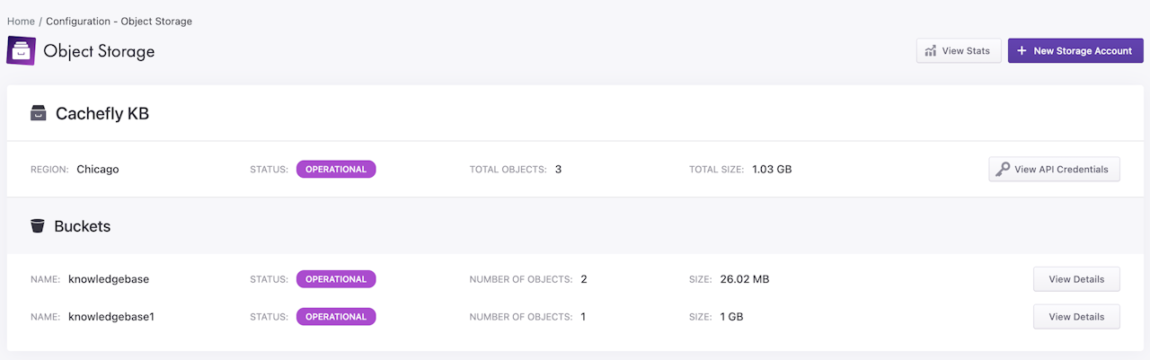 Our Object Storage is S3 compatible and allows users to create an object storage account, view API credentials, and see their object storage stats all from within the portal.